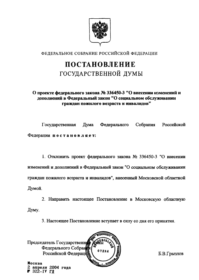 ПОСТАНОВЛЕНИЕ ГД ФС РФ от 02.04.2004 N 322-IV ГД