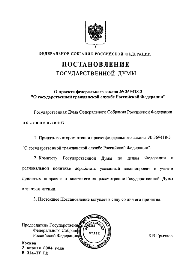 ПОСТАНОВЛЕНИЕ ГД ФС РФ от 02.04.2004 N 314-IV ГД