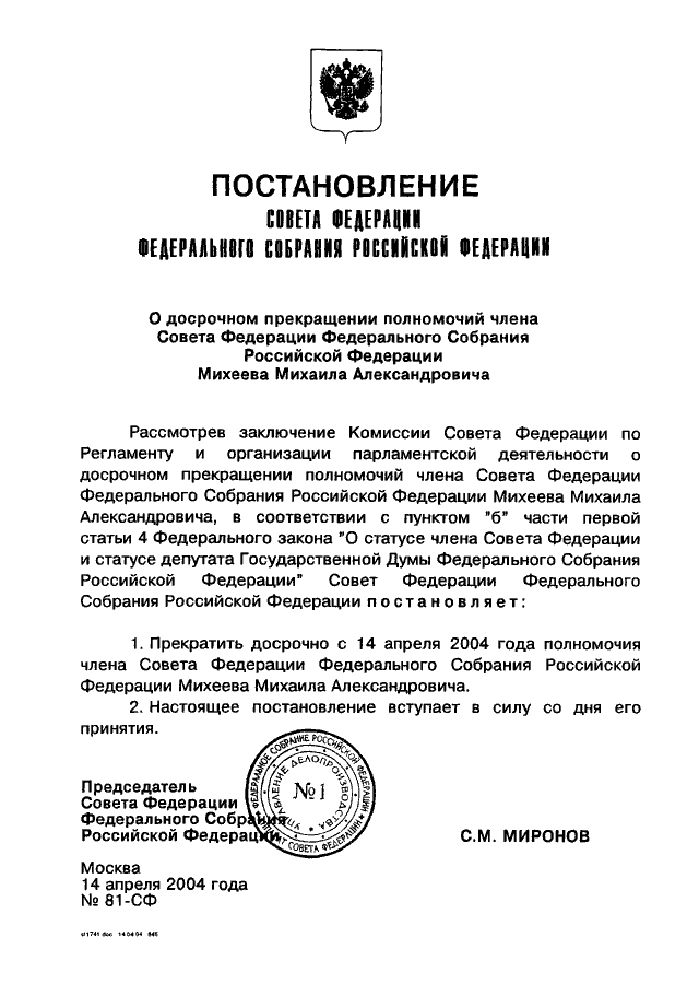 ПОСТАНОВЛЕНИЕ СФ ФС РФ от 14.04.2004 N 81-СФ