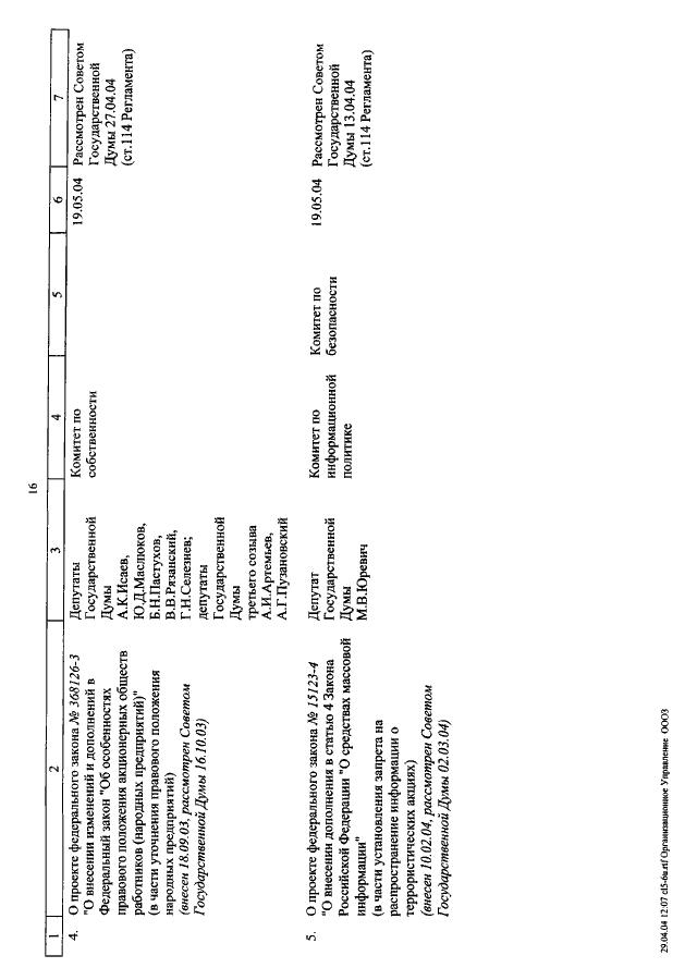 "О КАЛЕНДАРЕ РАССМОТРЕНИЯ ВОПРОСОВ ГОСУДАРСТВЕННОЙ ДУМОЙ С 12 МАЯ ПО 11 ИЮНЯ 2004 ГОДА"