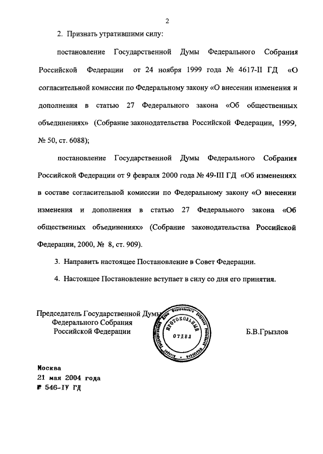ПОСТАНОВЛЕНИЕ ГД ФС РФ от 21.05.2004 N 546-IV ГД
