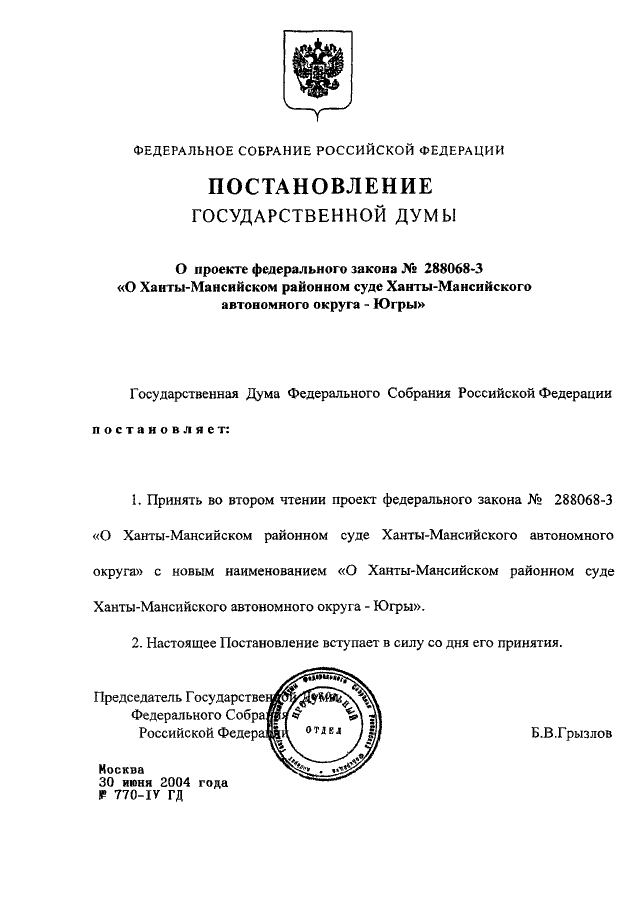ПОСТАНОВЛЕНИЕ ГД ФС РФ от 30.06.2004 N 770-IV ГД
