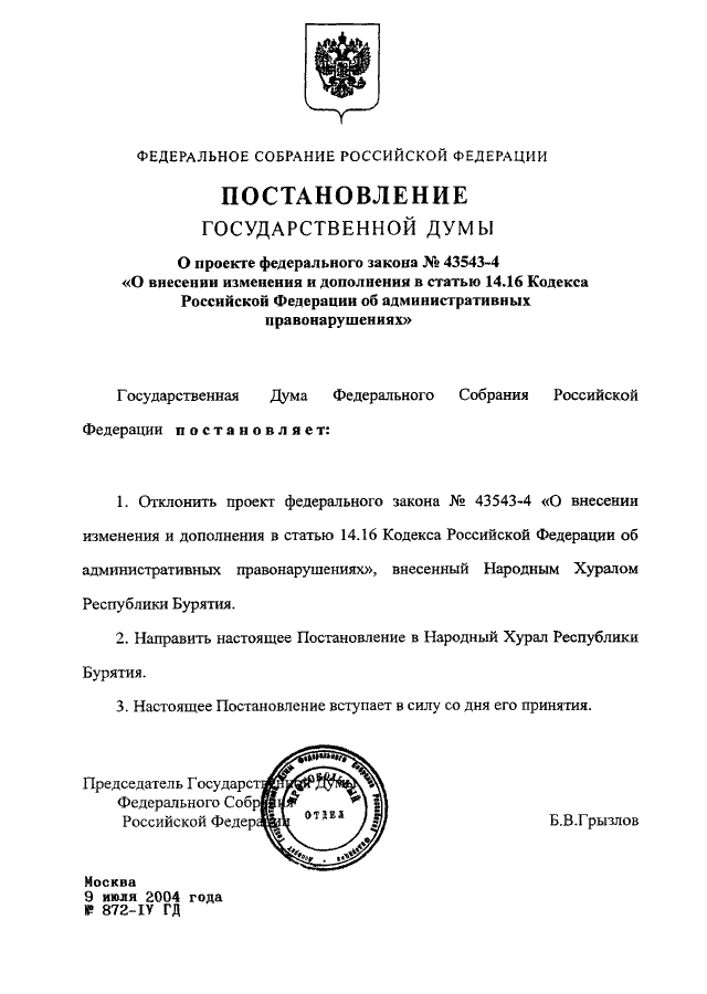ПОСТАНОВЛЕНИЕ ГД ФС РФ от 09.07.2004 N 872-IV ГД