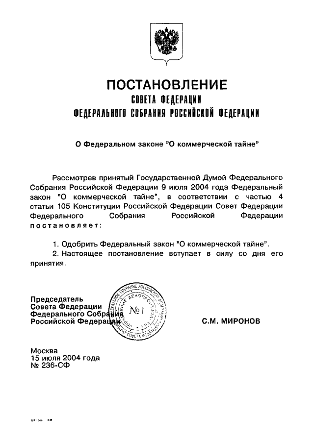 ПОСТАНОВЛЕНИЕ СФ ФС РФ от 15.07.2004 N 236-СФ