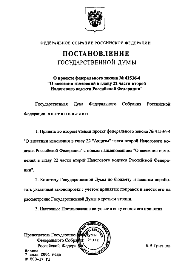 ПОСТАНОВЛЕНИЕ ГД ФС РФ от 07.07.2004 N 808-IV ГД