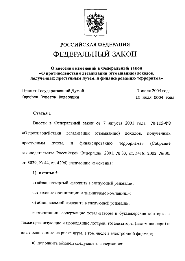 "О ВНЕСЕНИИ ИЗМЕНЕНИЙ В ФЕДЕРАЛЬНЫЙ ЗАКОН "О ПРОТИВОДЕЙСТВИИ ЛЕГАЛИЗАЦИИ (ОТМЫВАНИЮ) ДОХОДОВ, ПОЛУЧЕННЫХ ПРЕСТУПНЫМ ПУТЕМ, И ФИНАНСИРОВАНИЮ ТЕРРОРИЗМА"