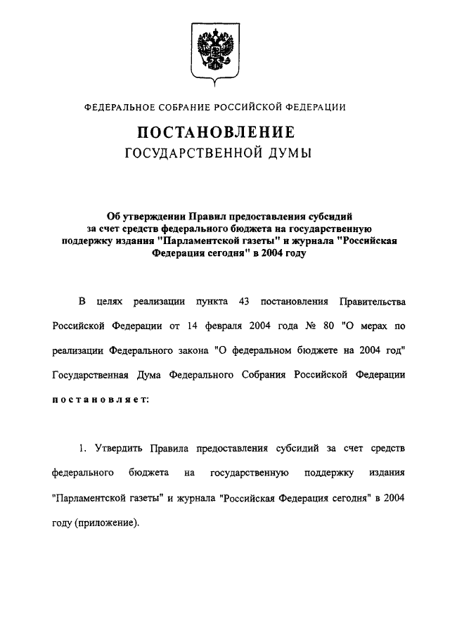 "ОБ УТВЕРЖДЕНИИ ПРАВИЛ ПРЕДОСТАВЛЕНИЯ СУБСИДИЙ ЗА СЧЕТ СРЕДСТВ ФЕДЕРАЛЬНОГО БЮДЖЕТА НА ГОСУДАРСТВЕННУЮ ПОДДЕРЖКУ ИЗДАНИЯ "ПАРЛАМЕНТСКОЙ ГАЗЕТЫ" И ЖУРНАЛА "РОССИЙСКАЯ ФЕДЕРАЦИЯ СЕГОДНЯ" В 2004 ГОДУ"