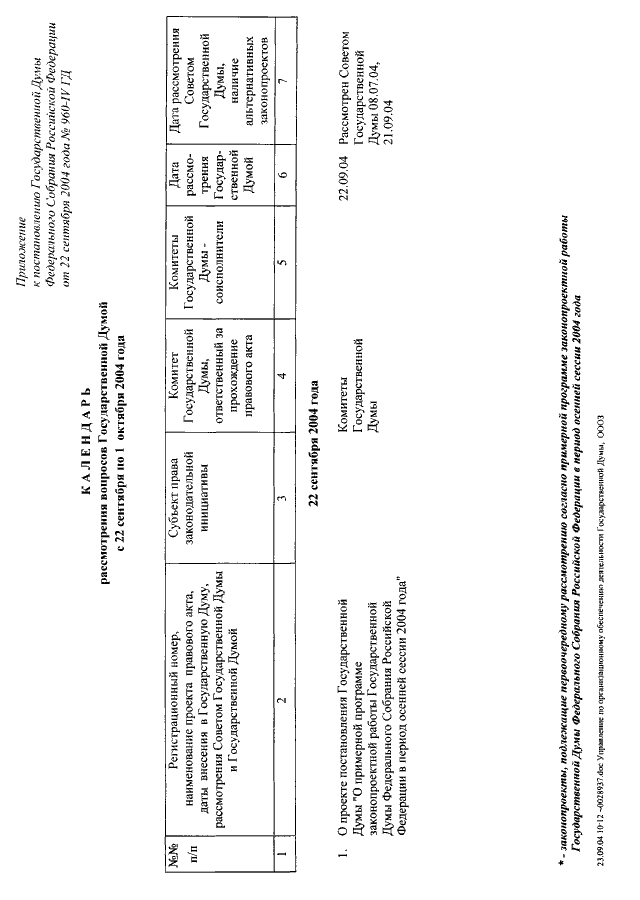 "О КАЛЕНДАРЕ РАССМОТРЕНИЯ ВОПРОСОВ ГОСУДАРСТВЕННОЙ ДУМОЙ С 22 СЕНТЯБРЯ ПО 1 ОКТЯБРЯ 2004 ГОДА"
