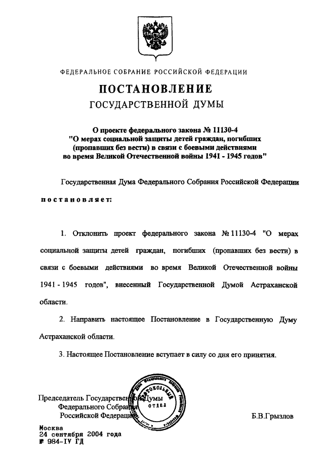 ПОСТАНОВЛЕНИЕ ГД ФС РФ от 24.09.2004 N 984-IV ГД