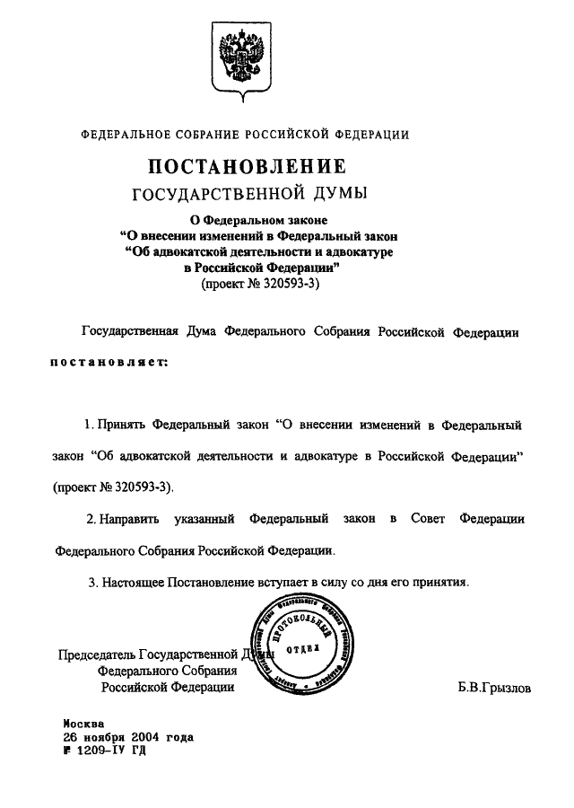 ПОСТАНОВЛЕНИЕ ГД ФС РФ от 26.11.2004 N 1209-IV ГД