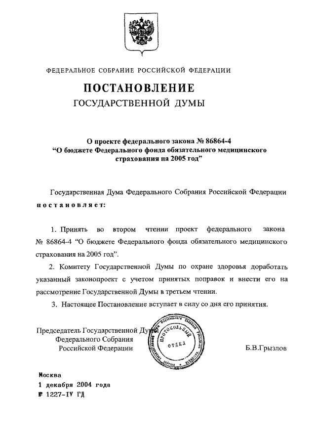ПОСТАНОВЛЕНИЕ ГД ФС РФ от 01.12.2004 N 1227-IV ГД
