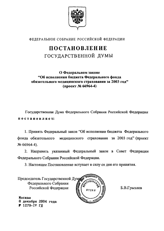ПОСТАНОВЛЕНИЕ ГД ФС РФ от 08.12.2004 N 1279-IV ГД