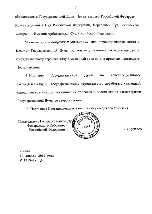ПОСТАНОВЛЕНИЕ ГД ФС РФ от 12.01.2005 N 1415-IV ГД