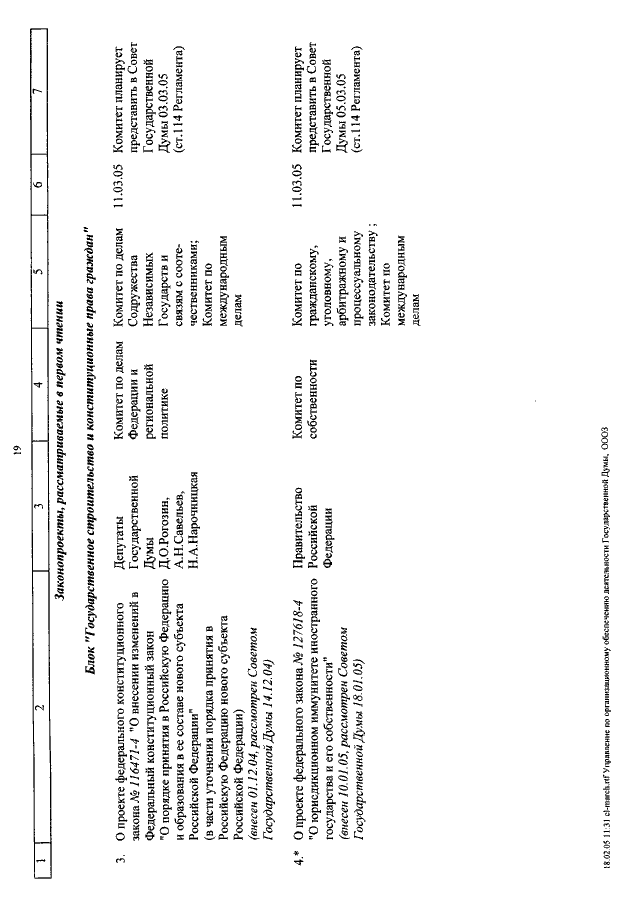 "О КАЛЕНДАРЕ РАССМОТРЕНИЯ ВОПРОСОВ ГОСУДАРСТВЕННОЙ ДУМОЙ СО 2 ПО 18 МАРТА 2005 ГОДА"