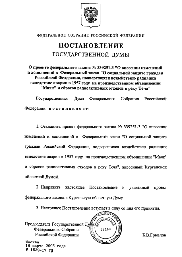 ПОСТАНОВЛЕНИЕ ГД ФС РФ от 18.03.2005 N 1639-IV ГД