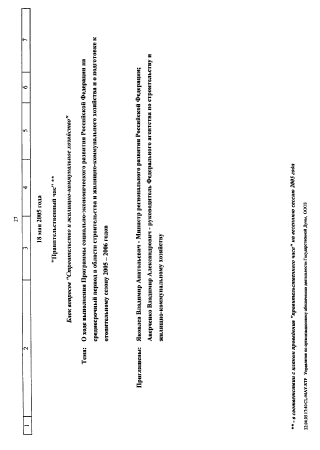 "О КАЛЕНДАРЕ РАССМОТРЕНИЯ ВОПРОСОВ ГОСУДАРСТВЕННОЙ ДУМОЙ С 11 ПО 27 МАЯ 2005 ГОДА"
