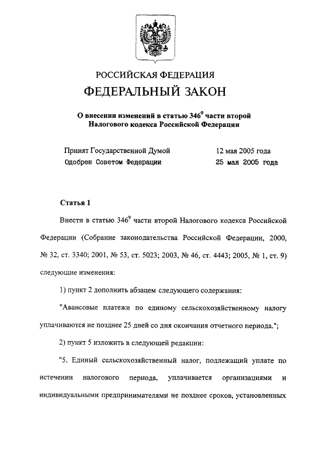 "О ВНЕСЕНИИ ИЗМЕНЕНИЙ В СТАТЬЮ 346.9 ЧАСТИ ВТОРОЙ НАЛОГОВОГО КОДЕКСА РОССИЙСКОЙ ФЕДЕРАЦИИ"