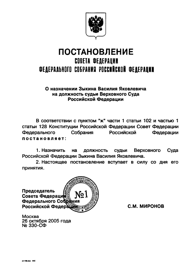"О НАЗНАЧЕНИИ ЗЫКИНА ВАСИЛИЯ ЯКОВЛЕВИЧА НА ДОЛЖНОСТЬ СУДЬИ ВЕРХОВНОГО СУДА РОССИЙСКОЙ ФЕДЕРАЦИИ"