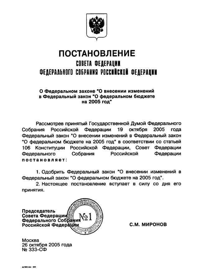 ПОСТАНОВЛЕНИЕ СФ ФС РФ от 26.10.2005 N 333-СФ