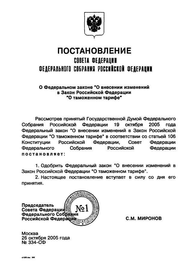 ПОСТАНОВЛЕНИЕ СФ ФС РФ от 26.10.2005 N 334-СФ