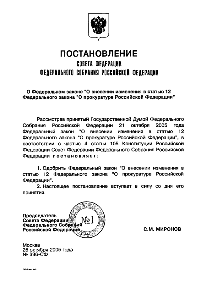 ПОСТАНОВЛЕНИЕ СФ ФС РФ от 26.10.2005 N 336-СФ