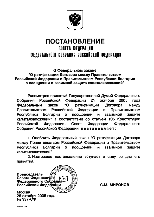 ПОСТАНОВЛЕНИЕ СФ ФС РФ от 26.10.2005 N 337-СФ