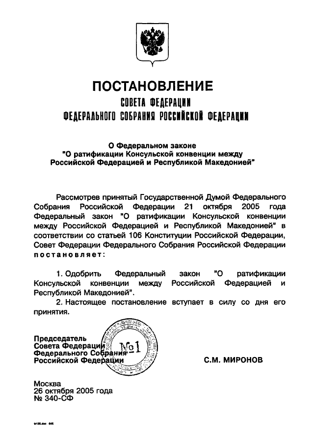 "О ФЕДЕРАЛЬНОМ ЗАКОНЕ "О РАТИФИКАЦИИ КОНСУЛЬСКОЙ КОНВЕНЦИИ МЕЖДУ РОССИЙСКОЙ ФЕДЕРАЦИЕЙ И РЕСПУБЛИКОЙ МАКЕДОНИЕЙ"
