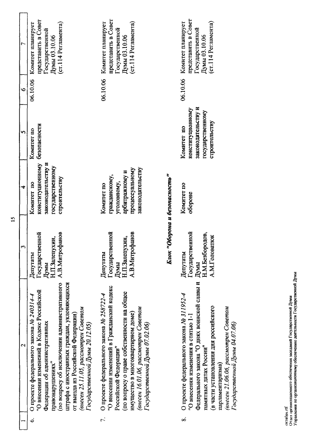 "О КАЛЕНДАРЕ РАССМОТРЕНИЯ ВОПРОСОВ ГОСУДАРСТВЕННОЙ ДУМОЙ С 4 ПО 20 ОКТЯБРЯ 2006 ГОДА"