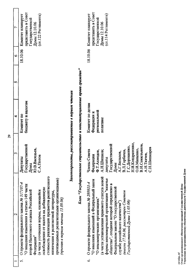 "О КАЛЕНДАРЕ РАССМОТРЕНИЯ ВОПРОСОВ ГОСУДАРСТВЕННОЙ ДУМОЙ С 4 ПО 20 ОКТЯБРЯ 2006 ГОДА"