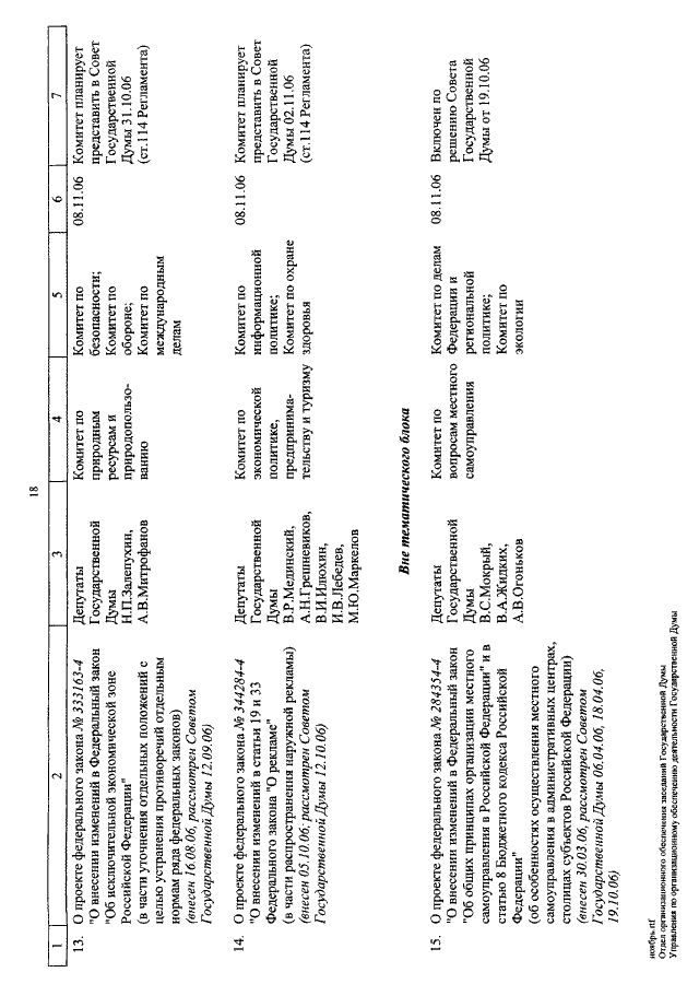 "О КАЛЕНДАРЕ РАССМОТРЕНИЯ ВОПРОСОВ ГОСУДАРСТВЕННОЙ ДУМОЙ С 1 ПО 24 НОЯБРЯ 2006 ГОДА"