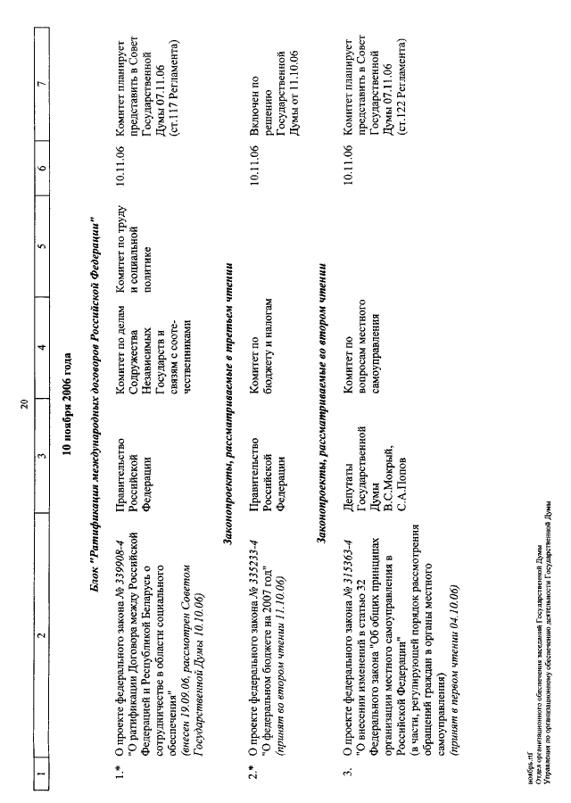 "О КАЛЕНДАРЕ РАССМОТРЕНИЯ ВОПРОСОВ ГОСУДАРСТВЕННОЙ ДУМОЙ С 1 ПО 24 НОЯБРЯ 2006 ГОДА"