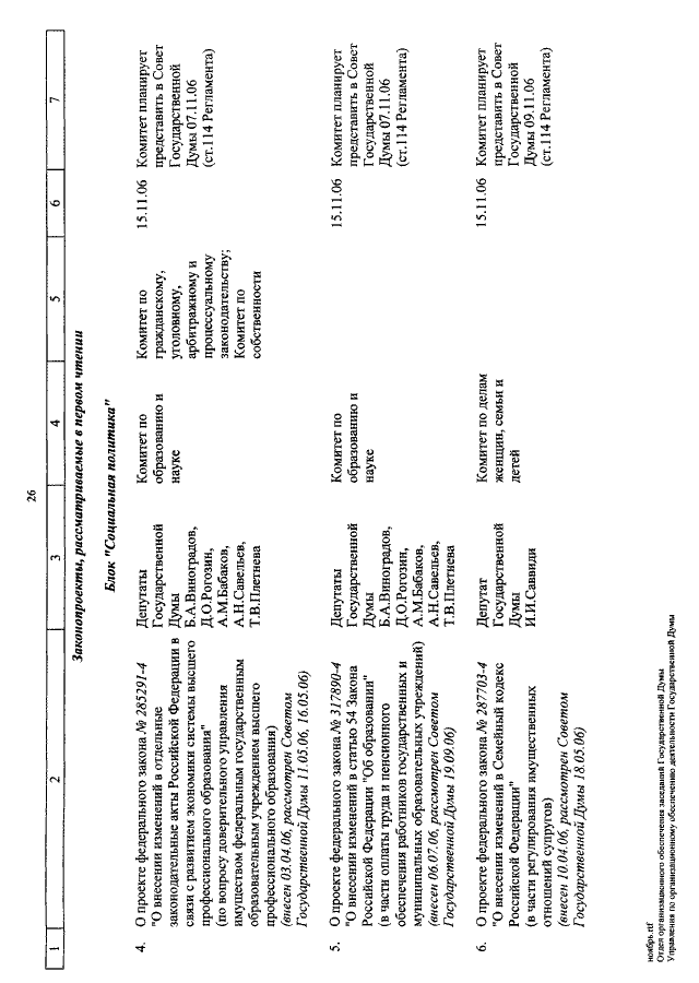 "О КАЛЕНДАРЕ РАССМОТРЕНИЯ ВОПРОСОВ ГОСУДАРСТВЕННОЙ ДУМОЙ С 1 ПО 24 НОЯБРЯ 2006 ГОДА"