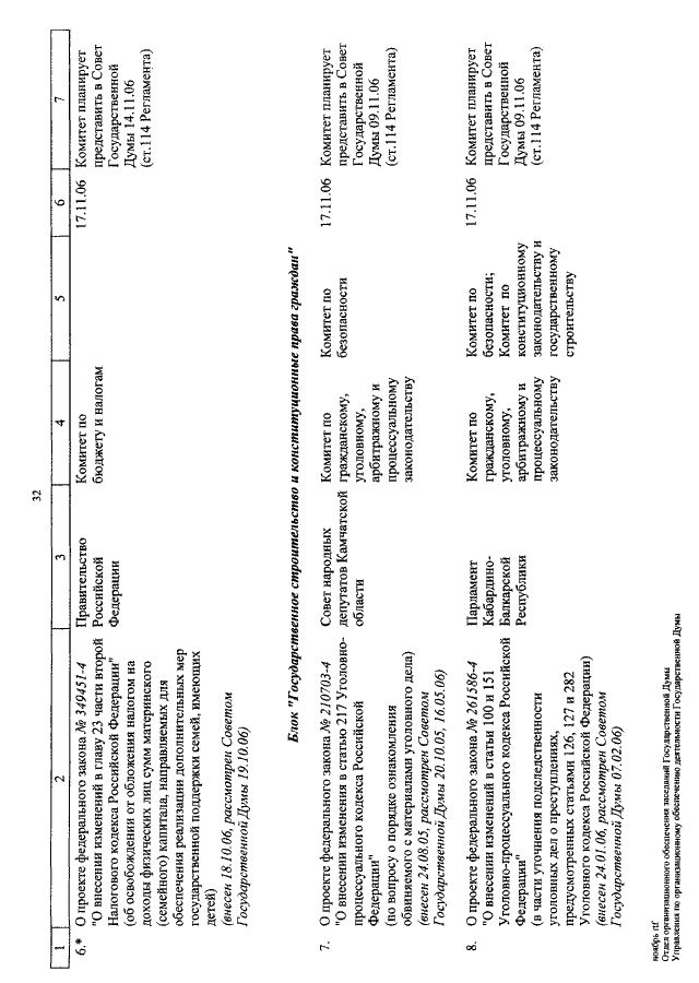 "О КАЛЕНДАРЕ РАССМОТРЕНИЯ ВОПРОСОВ ГОСУДАРСТВЕННОЙ ДУМОЙ С 1 ПО 24 НОЯБРЯ 2006 ГОДА"