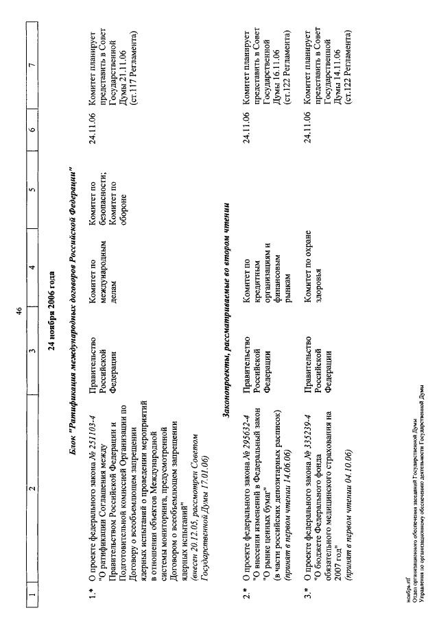 "О КАЛЕНДАРЕ РАССМОТРЕНИЯ ВОПРОСОВ ГОСУДАРСТВЕННОЙ ДУМОЙ С 1 ПО 24 НОЯБРЯ 2006 ГОДА"