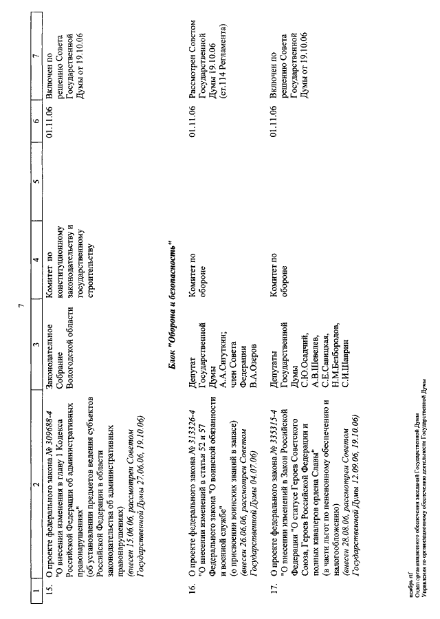 "О КАЛЕНДАРЕ РАССМОТРЕНИЯ ВОПРОСОВ ГОСУДАРСТВЕННОЙ ДУМОЙ С 1 ПО 24 НОЯБРЯ 2006 ГОДА"