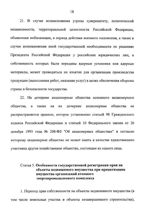 "ОБ ОСОБЕННОСТЯХ УПРАВЛЕНИЯ И РАСПОРЯЖЕНИЯ ИМУЩЕСТВОМ И АКЦИЯМИ ОРГАНИЗАЦИЙ, ОСУЩЕСТВЛЯЮЩИХ ДЕЯТЕЛЬНОСТЬ В ОБЛАСТИ ИСПОЛЬЗОВАНИЯ АТОМНОЙ ЭНЕРГИИ, И О ВНЕСЕНИИ ИЗМЕНЕНИЙ В ОТДЕЛЬНЫЕ ЗАКОНОДАТЕЛЬНЫЕ АКТЫ РОССИЙСКОЙ ФЕДЕРАЦИИ"