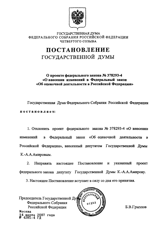ПОСТАНОВЛЕНИЕ ГД ФС РФ от 14.03.2007 N 4281-4 ГД