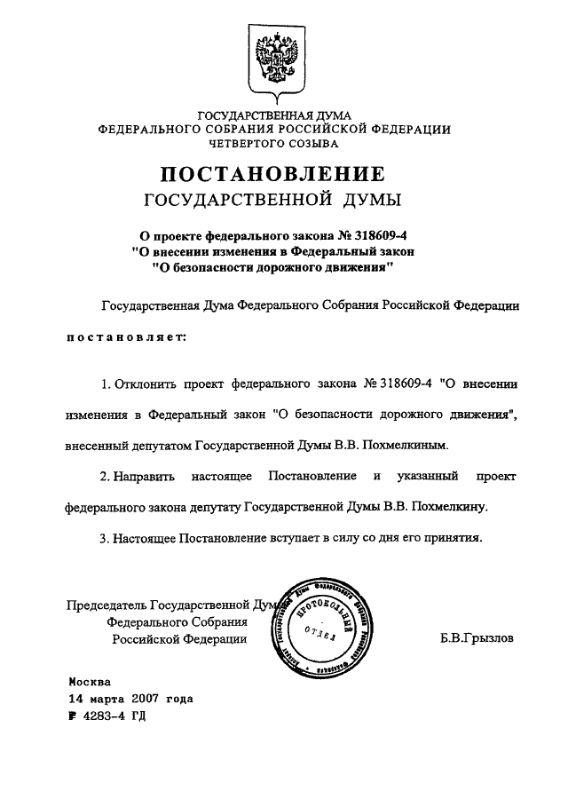 ПОСТАНОВЛЕНИЕ ГД ФС РФ от 14.03.2007 N 4283-4 ГД