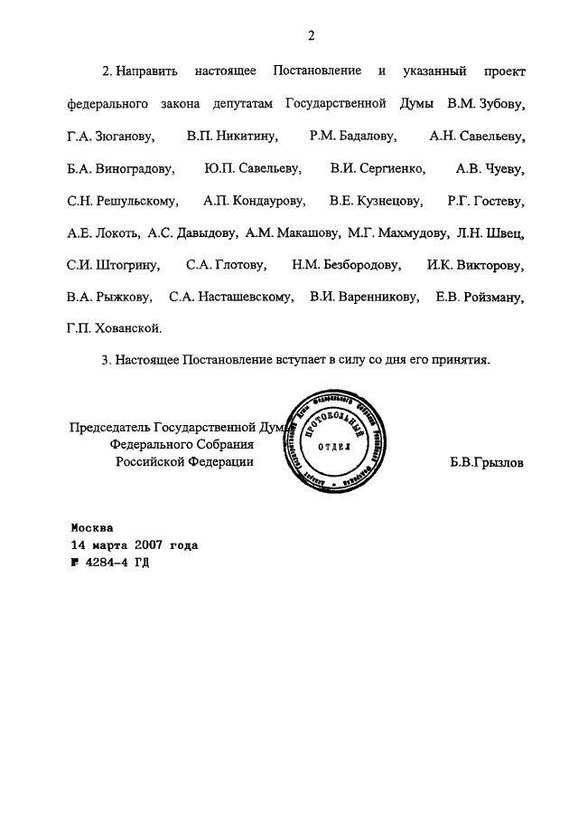 ПОСТАНОВЛЕНИЕ ГД ФС РФ от 14.03.2007 N 4284-4 ГД