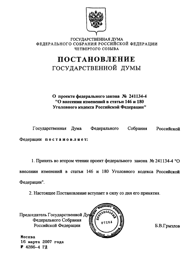 ПОСТАНОВЛЕНИЕ ГД ФС РФ от 16.03.2007 N 4286-4 ГД