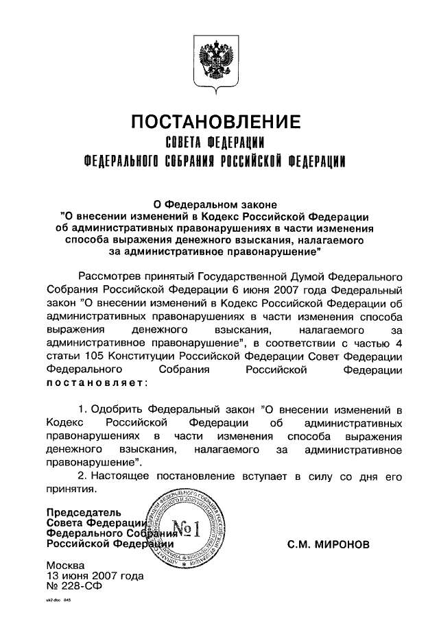 ПОСТАНОВЛЕНИЕ СФ ФС РФ от 13.06.2007 N 228-СФ