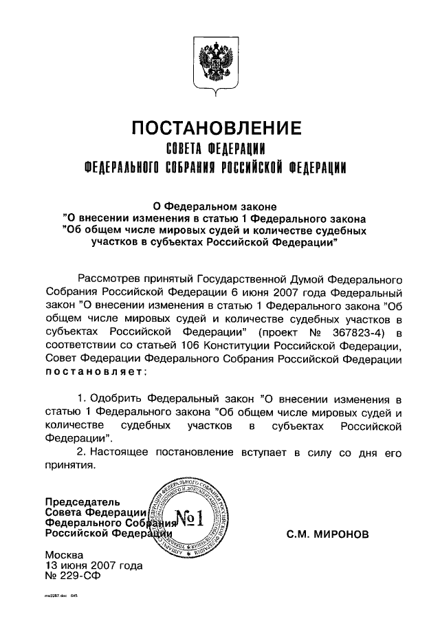 ПОСТАНОВЛЕНИЕ СФ ФС РФ от 13.06.2007 N 229-СФ