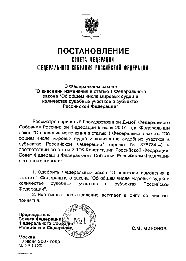 ПОСТАНОВЛЕНИЕ СФ ФС РФ от 13.06.2007 N 230-СФ