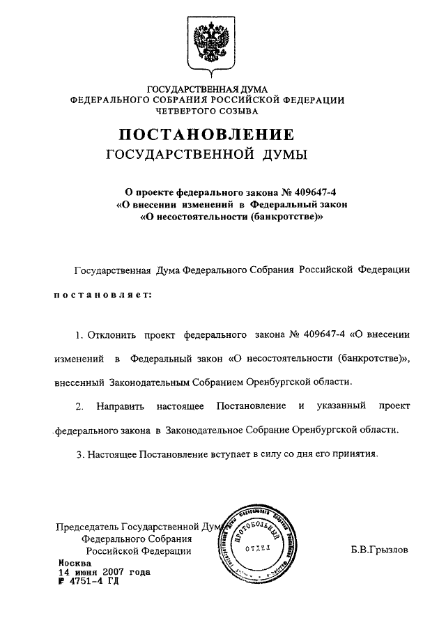 ПОСТАНОВЛЕНИЕ ГД ФС РФ от 14.06.2007 N 4751-4 ГД