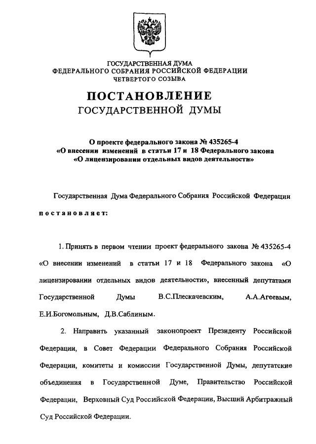 "О ПРОЕКТЕ ФЕДЕРАЛЬНОГО ЗАКОНА N 435265-4 "О ВНЕСЕНИИ ИЗМЕНЕНИЙ В СТАТЬИ 17 И 18 ФЕДЕРАЛЬНОГО ЗАКОНА "О ЛИЦЕНЗИРОВАНИИ ОТДЕЛЬНЫХ ВИДОВ ДЕЯТЕЛЬНОСТИ"