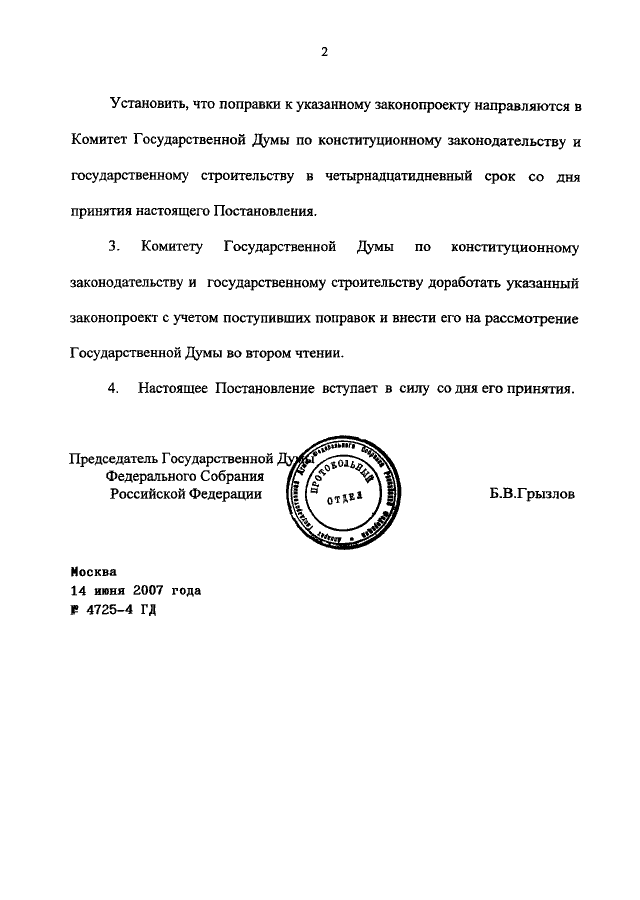 ПОСТАНОВЛЕНИЕ ГД ФС РФ от 14.06.2007 N 4725-4 ГД