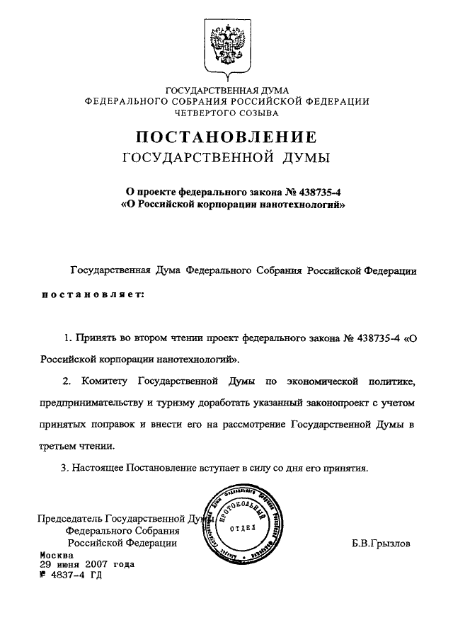 ПОСТАНОВЛЕНИЕ ГД ФС РФ от 29.06.2007 N 4837-4 ГД