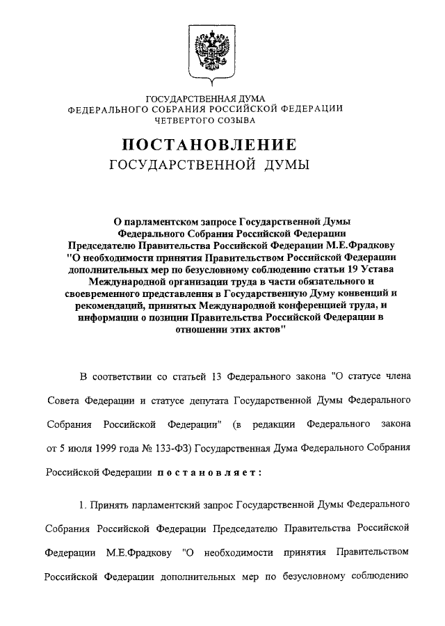 "О ПАРЛАМЕНТСКОМ ЗАПРОСЕ ГОСУДАРСТВЕННОЙ ДУМЫ ФЕДЕРАЛЬНОГО
