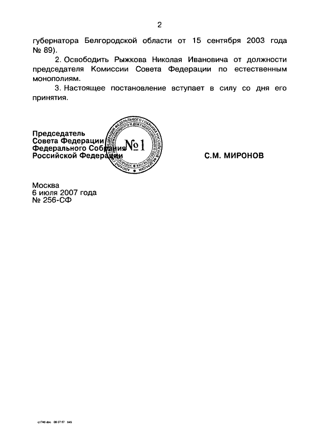 ПОСТАНОВЛЕНИЕ СФ ФС РФ от 06.07.2007 N 256-СФ