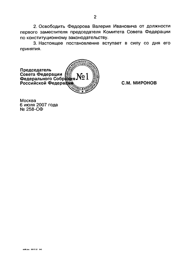 ПОСТАНОВЛЕНИЕ СФ ФС РФ от 06.07.2007 N 258-СФ